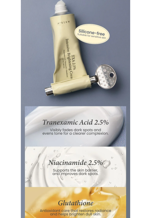 a crème éclaircissante intensive AXIS-Y TXA 2,5 % est un soin ciblé conçu pour unifier le teint, atténuer les taches brunes et redonner de l'éclat à la peau. Formulée à partir d'un puissant mélange d'acide tranexamique, de niacinamide et de glutathion, cette crème éclaircissante réduit l'apparence de l'hyperpigmentation et des imperfections, tout en rendant la peau plus lumineuse et éclatante.